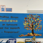 Στη συνέχεια γνώρισαν τη “Μιμή τη Γραμμή”, το λούτρινο φίδι που τους μύησε στα είδη των γραμμών. Με διάφορα υλικά και μέσα, σχεδίασαν, έκοψαν και αποτύπωσαν γραμμές, έφτιαξαν ομαδικά μια τίγρη με οριζόντιες και κάθετες γραμμές και συνέθεσαν ένα γλυπτό από γραμμές στις τρεις διαστάσεις. Διπλώνοντας, τσακίζοντας, τυλίγοντας και κολλώντας χάρτινες λωρίδες τα παιδιά εξασκήθηκαν σε λεπτούς χειρισμούς, αντιλήφθηκαν χωρικές έννοιες και απόλαυσαν τη δημιουργία. Τέλος, με στιγμές και γραμμές στόλισαν τη φυλλωσιά ενός δέντρου στο ταμπλό τής τάξης για να καλωσορίσουν το Φθινόπωρο.