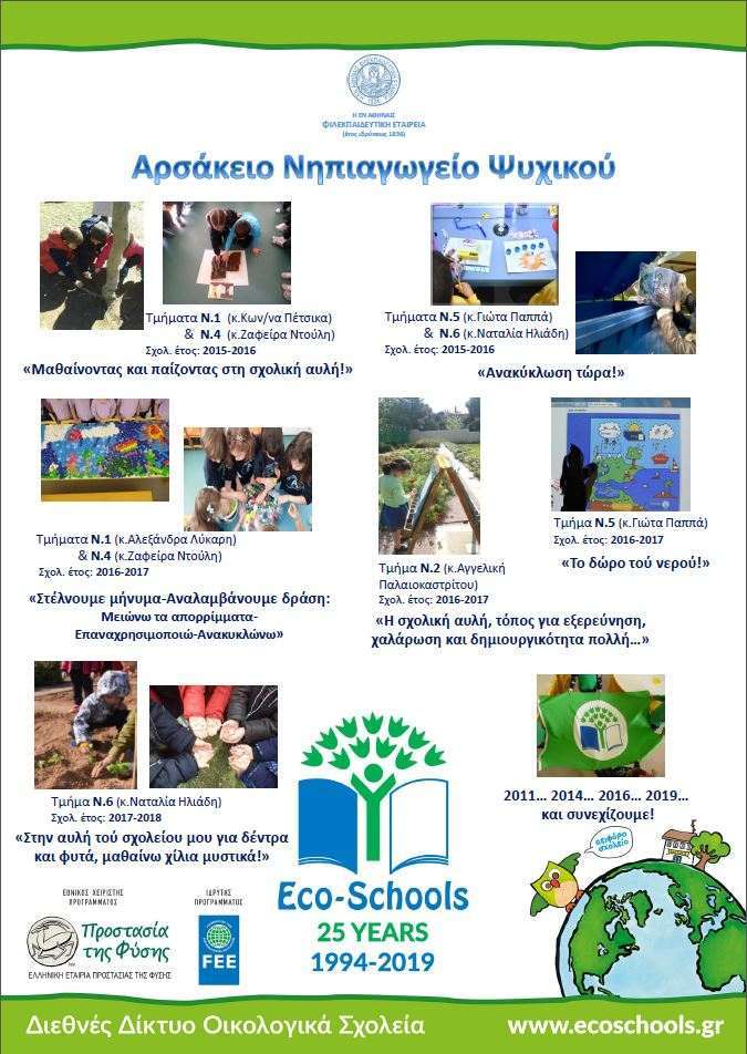 Για τη συμμετοχή του στο Πρόγραμμα τού Διεθνούς Δικτύου Περιβαλλοντικής Εκπαίδευσης «Οικολογικά Σχολεία – EcoSchools» βραβεύτηκε το Αρσάκειο Νηπιαγωγείο Ψυχικού το Σάββατο 6 Απριλίου 2019. Το πρόγραμμα ξεκίνησε στην Ελλάδα το 1995 και απευθύνεται σε μαθητές σχολείων όλων των εκπαιδευτικών βαθμίδων.