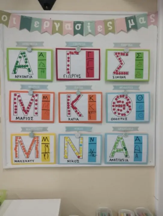 Η αποστολή ξεκίνησε με πολύ παιχνίδι. Μέσα από κινητικά παιχνίδια άρχισαν να «κυνηγούν» και να ανακαλύπτουν το όνομά τους ανάμεσα στα άλλα, ενώ με πολύχρωμα χαρτάκια έφτιαξαν μια μεγάλη αφίσα γεμάτη ονόματα. Τα μπερδεμένα γράμματα πήραν σιγά σιγά τη σωστή σειρά και το όνομα τού κάθε παιδιού εμφανίστηκε μπροστά του σαν μικρό «μαγικό» μυστικό. Έμαθαν ποιο είναι το αρχικό γράμμα τού ονόματός τους και το έγραψαν με περηφάνια. Στη συνέχεια, κάθε γράμμα στολίστηκε με πολύχρωμες τελείες και μεταμορφώθηκε σε μικρό έργο τέχνης!