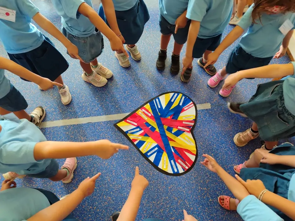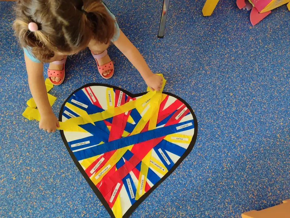 Αμέσως μετά τα χρώματα μπερδεύτηκαν και ένα πείραμα ξεδιπλώθηκε μπροστά τους! Οι μείξεις των χρωμάτων φανερώθηκαν και η έκπληξη στα προσωπάκια των παιδιών δημιούργησαν ένα πολύ όμορφο κλίμα στη τάξη. Στο τέλος κάθε παιδί κόλλησε τη δική του κορδέλα σε μια μεγάλη καρδιά, βάζοντας δίπλα την υπογραφή του… και το σύμβολο τής τάξης σχηματίστηκε στη στιγμή! Θα ενώνει την ομάδα όλη τη χρονιά, χαρίζοντας την αγάπη απλόχερα στα μέλη της!