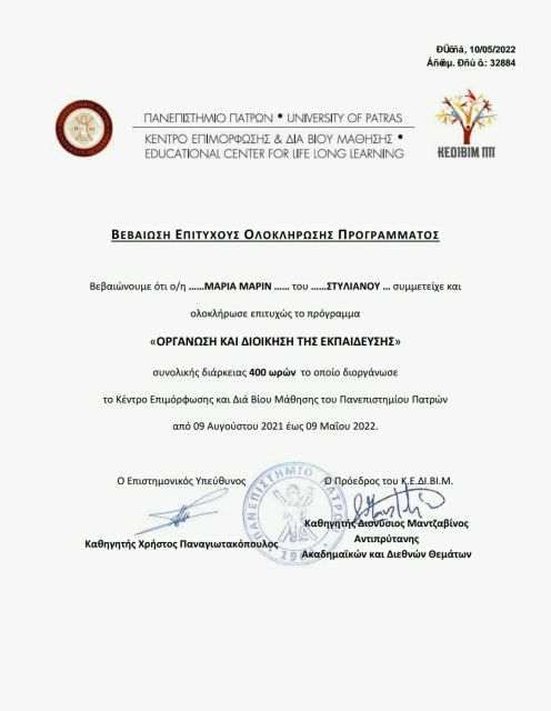 Η καθηγήτρια Αγγλικής Γλώσσας τού Α΄ Αρσακείου Γυμνασίου Ψυχικού κ. Μαίρη Μαρίν παρακολούθησε επιτυχώς το 9μηνο επιμορφωτικό πρόγραμμα με τίτλο «Οργάνωση και Διοίκηση τής Εκπαίδευσης», διαρκείας 400 ωρών, που ολοκληρώθηκε τον Οκτώβριο τού 2021 και διοργανώθηκε από το Κέντρο Επιμόρφωσης και Διά Βίου Μάθησης (ΕΚΕΚ) τού Πανεπιστημίου Πατρών.