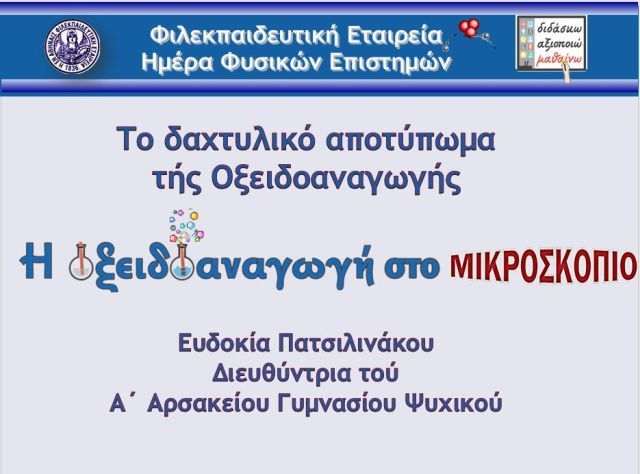 Η Διευθύντρια τού Α΄ Αρσακείου Γυμνασίου Ψυχικού κ. Ευδοκία Πατσιλινάκου, χημικός PhD, παρουσίασε ένα σενάριο σε δέκα διδακτικές πράξεις, με θέμα: «Το δαχτυλικό αποτύπωμα τής οξειδοαναγωγής». Η παρουσίαση πραγματοποιήθηκε στο πλαίσιο τής ημερίδας, σε αίθουσα των Αρσακείων Σχολείων Ιωαννίνων, με προεδρεύοντες τους κ. Κωνσταντίνο Σκομπρίδη, καθηγητή τού Τμήματος Χημείας Πανεπιστημίου Ιωαννίνων, Δημήτριο Κόρακα, Σχολικό Σύμβουλο Φυσικών Επιστημών Δευτεροβάθμιας Εκπαίδευσης Ιωαννίνων και Γεώργιο Θυφρονίτη, ομότιμο καθηγητή τού Τμήματος Βιολογικών Εφαρμογών και Τεχνολογιών τού Πανεπιστημίου Ιωαννίνων.
