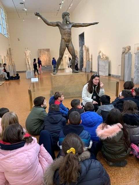 Τα παιδιά παρατήρησαν αμφορείς τής γεωμετρικής περιόδου και συνέχισαν την ξενάγησή τους στα γλυπτά και τα αγάλματα τής αρχαϊκής εποχής, τους κούρους και τις κόρες. Εντυπωσιάστηκαν από το χάλκινο άγαλμα τού Δία, καθώς και από τον μικρό ιππέα τού Αρτεμισίου, έργα τέχνης τής κλασικής περιόδου.