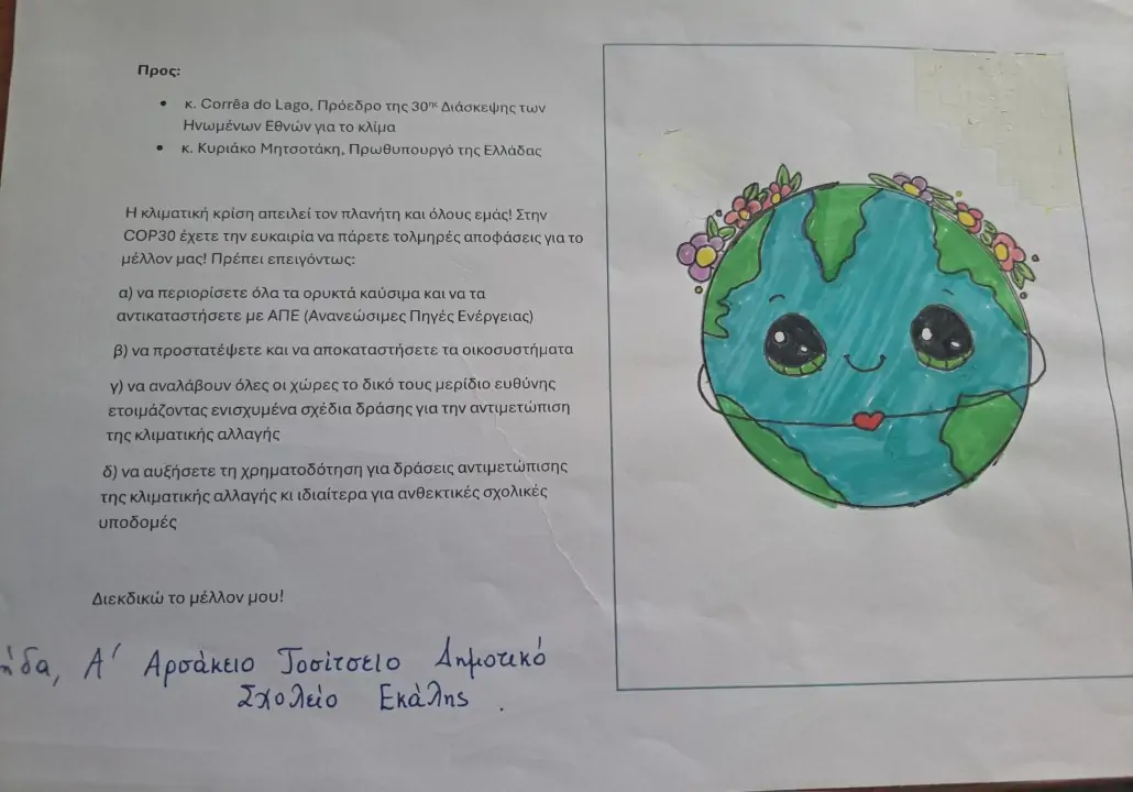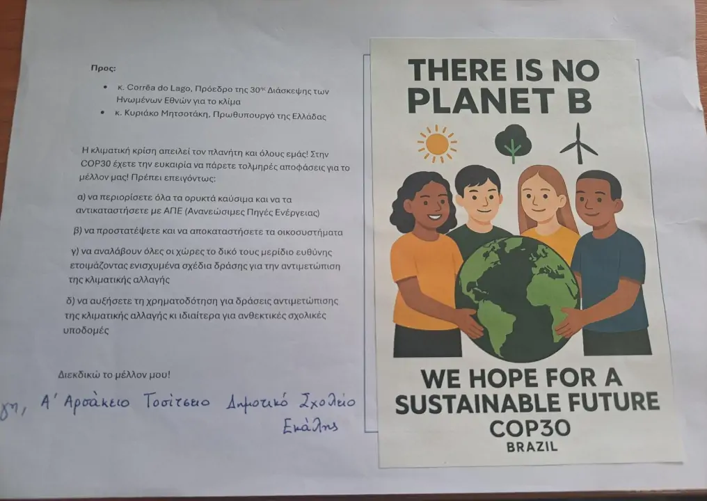 Με αφορμή την 30η Διεθνή Διάσκεψη για την Κλιματική Αλλαγή (COP30), που πραγματοποιείται στη Βραζιλία από τις 10 έως τις 21 Νοεμβρίου 2025, οι μαθητές και οι μαθήτριες της ΣΤ τάξης ,του Α ΄Αρσακείου Τοσιτσείου Δημοτικού Σχολείου , συμμετείχαν σε μια ξεχωριστή δράση με στόχο να ακουστεί η φωνή τους σε παγκόσμιο επίπεδο.