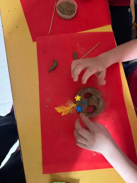 Έπειτα με πρότυπο αρχαιοελληνικές μάσκες και βασικό υλικό τον πηλό, τα παιδιά έπλασαν, σκάλισαν και διαμόρφωσαν τις δικές τους πρωτότυπες μάσκες. Χρησιμοποίησαν διάφορα διακοσμητικά υλικά, όπως χρυσόσκονη, φτερά και χρώματα, δίνοντας φαντασία και προσωπικό χαρακτήρα στις δημιουργίες τους. Η χαρά και η δημιουργικότητα ήταν εμφανείς σε κάθε στάδιο της διαδικασίας.