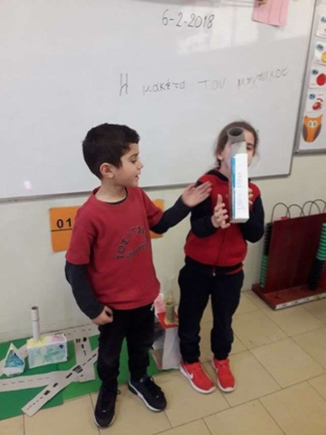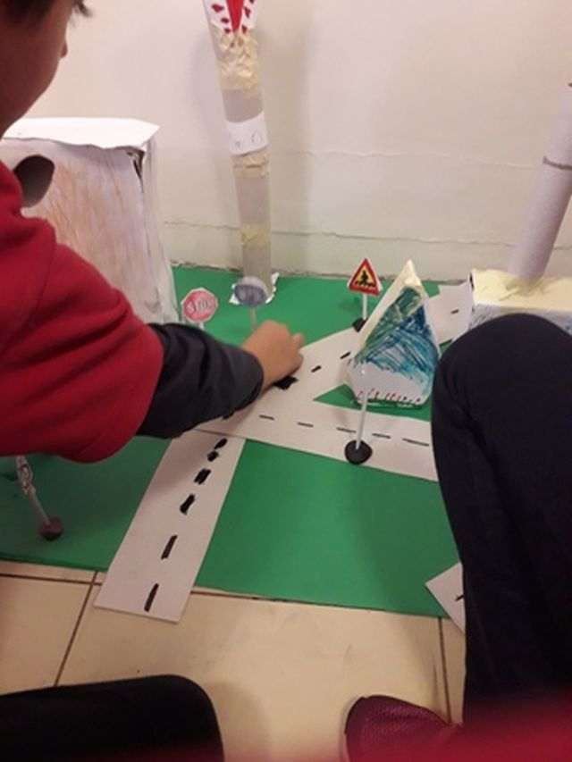 Ακολούθως, οι μικροί μηχανικοί τής τάξης στο μάθημα τής Δημιουργικής Σκέψης κατασκεύασαν «μια πόλη, όπου όλοι κυκλοφορούν με ασφάλεια» χρησιμοποιώντας ανακυκλώσιμα υλικά. Τα παιδιά, χωρισμένα σε ομάδες, πειραματίστηκαν με διάφορα υλικά και δημιούργησαν τα δικά τους κτήρια στα οποία έδωσαν ευφάνταστα ονόματα. Στη συνέχεια, τοποθέτησαν το ξενοδοχείο «Μπλε όνειρα», τον ουρανοξύστη «Μαύρη φάλαινα», τον «Πύργο τής αγάπης», το «Ανοιχτό σπίτι με το μαγικό σωλήνα εξαφάνισης σκουπιδιών» και τις υπόλοιπες δημιουργίες τους πάνω σε χαρτόνι δημιουργώντας μια μακέτα. Αναρωτήθηκαν για το σημείο που θα βρίσκεται το κάθε κτήριο, οι δρόμοι και τα σήματα, που δημιούργησαν στο μάθημα τής Μελέτης Περιβάλλοντος, έτσι ώστε όλα να συνδέονται.