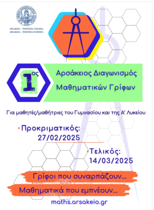Στις 10 Φεβρουαρίου πραγματοποιήθηκε στα Αρσάκεια Σχολεία μας ο 2ος Αρσάκειος Διαγωνισμός Μαθηματικών Γρίφων. Εξήντα οχτώ (68) μαθητές από όλα τα τμήματα του Α’ Αρσακείου-Τοσιτσείου Γυμνασίου Εκάλης συμμετείχαν στον διαγωνισμό και δεκαέξι (16) από αυτούς προκρίθηκαν στην επόμενη φάση του. Ο διαγωνισμός είχε ως στόχο να δείξει ότι τα μαθηματικά δεν είναι μόνο τύποι, θεωρήματα και ασκήσεις αλλά και παιχνίδι, φαντασία και πρόκληση. Υπεύθυνη για την οργάνωση και τη διεξαγωγή του εν λόγω διαγωνισμού για το Α’ Γυμνάσιο ήταν η Υποδιευθύντρια και μαθηματικός κ. Μαρία Καραγεωργίου. Συγχαρητήρια σε όλους τους μαθητές που έλαβαν μέρος.