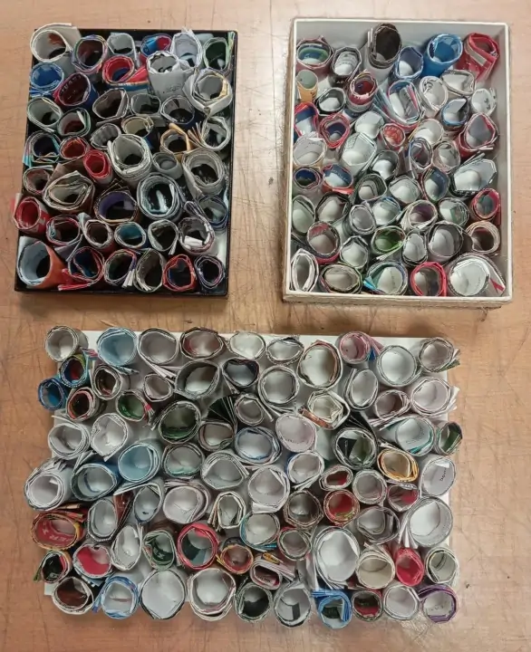 Από περιοδικά σε δίσκους και θήκες καλλυντικών: Παράλληλα, χρησιμοποιώντας παλιά περιοδικά, δημιούργησαν πρωτότυπους δίσκους με δαχτυλίδια-θήκες για μικρά δείγματα καλλυντικών, όπως κραγιόν και αρώματα. Κάθε κατασκευή ήταν μοναδική, με χρώματα και υφές που προέκυψαν από την επαναχρησιμοποίηση των εντύπων.