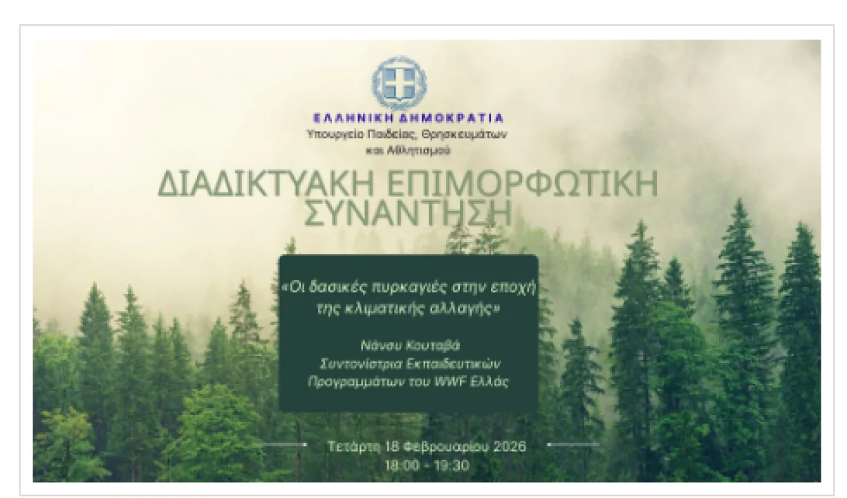 Την Τετάρτη 18 Φεβρουαρίου 2026 πραγματοποιήθηκε η διαδικτυακή επιμορφωτική συνάντηση της Διεύθυνσης Δευτεροβάθμιας Εκπαίδευσης Ανατολικής Αττικής με θέμα «Οι δασικές πυρκαγιές στην εποχή της κλιματικής αλλαγής». Η δράση εντάχθηκε στο πλαίσιο της Ημερίδας για την Κλιματική Αλλαγή που θα ακολουθήσει και αποτέλεσε μια σημαντική ευκαιρία ενημέρωσης και ευαισθητοποίησης των εκπαιδευτικών. Από το Α΄ Αρσάκειο-Τοσίτσειο Γυμνάσιο Εκάλης επιμορφώθηκε η κ. Μαρία Σόφη, τεχνολόγος.