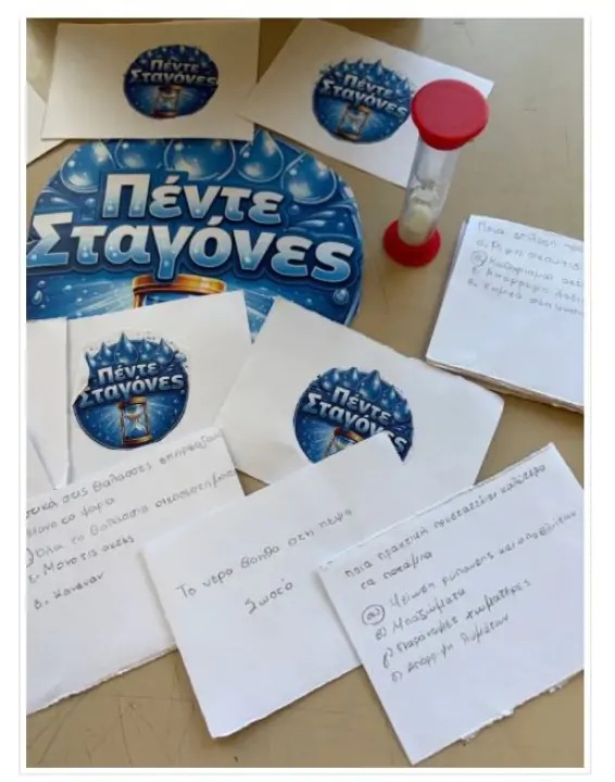 Μετά από ψηφοφορία, επιλέχθηκε προς υλοποίηση η ιδέα που έλαβε τις περισσότερες ψήφους. Τα παιδιά χωρίστηκαν σε ομάδες εργασίας και, με την καθοδήγηση της καθηγήτριάς τους, κατασκεύασαν το παιχνίδι στο Εργαστήριο Καλλιτεχνικών του Σχολείου.  Το «Πέντε Σταγόνες» είναι ένα καινοτόμο και δυναμικό επιτραπέζιο παιχνίδι γνώσεων με κεντρικό άξονα το νερό, την εξοικονόμησή του και την υπεύθυνη διαχείριση των υδάτινων πόρων, σχεδιασμένο για να καλλιεργεί την περιβαλλοντική συνείδηση των μαθητών μέσα από το παιχνίδι. Οι παίκτες καλούνται να απαντήσουν γρήγορα, μέσα σε πέντε δευτερόλεπτα, σε ερωτήσεις που αφορούν τη σημασία του νερού για τον άνθρωπο, τις φυσικές καταστροφές που σχετίζονται με αυτό, την προστασία ποταμών, λιμνών και θαλάσσιων οικοσυστημάτων, καθώς και απλές καθημερινές πρακτικές εξοικονόμησης νερού. Κάθε σωστή απάντηση ανταμείβεται με έναν πόντο και την κάρτα της ερώτησης, ενισχύοντας τη γρήγορη σκέψη, τη συγκέντρωση και τη συνεργασία, ενώ ταυτόχρονα μετατρέπει τη γνώση σε βιωματική εμπειρία. Μέσα από τον περιορισμένο χρόνο και τη διαδοχική συμμετοχή όλων των παικτών, το παιχνίδι προάγει τη μάθηση μέσω της δράσης και βοηθά τους μαθητές να κατανοήσουν ότι η εξοικονόμηση νερού δεν είναι απλώς μια πληροφορία, αλλά μια στάση ζωής απαραίτητη για το παρόν και το μέλλον του πλανήτη.
