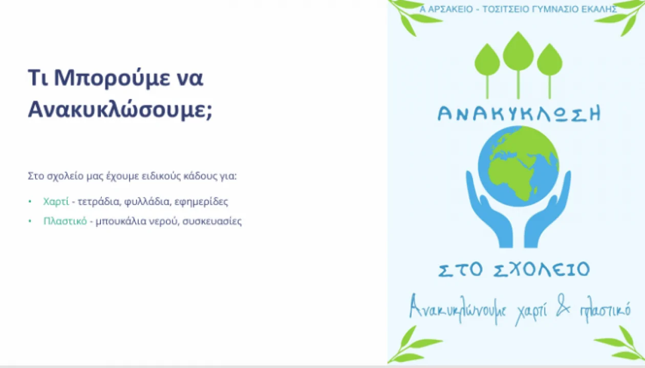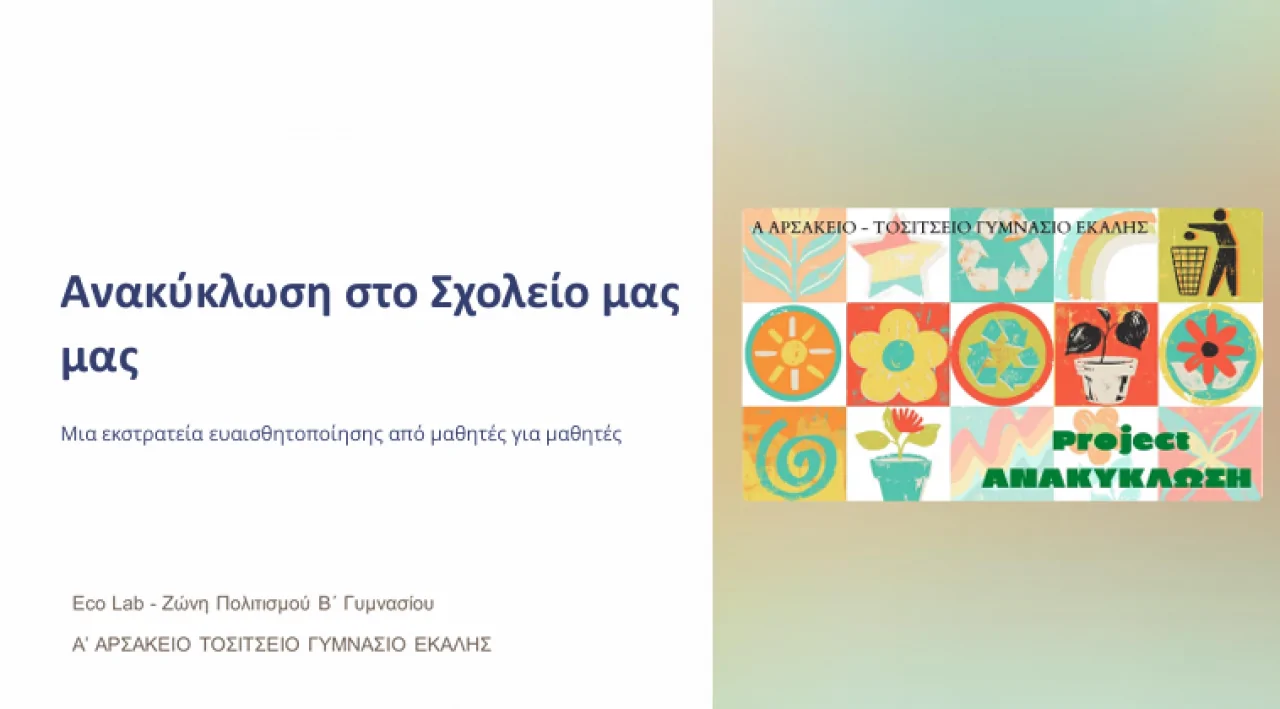 Με κεντρικό μήνυμα την ευαισθητοποίηση για την προστασία του περιβάλλοντος, η ομάδα Eco Lab της Ζώνης Πολιτισμού Β’ Τάξης του Α΄ Αρσακείου-Τοσιτσείου Γυμνασίου Εκάλης παρουσίασε στο θέατρο του σχολείου μια δράση ενημέρωσης για την ανακύκλωση.