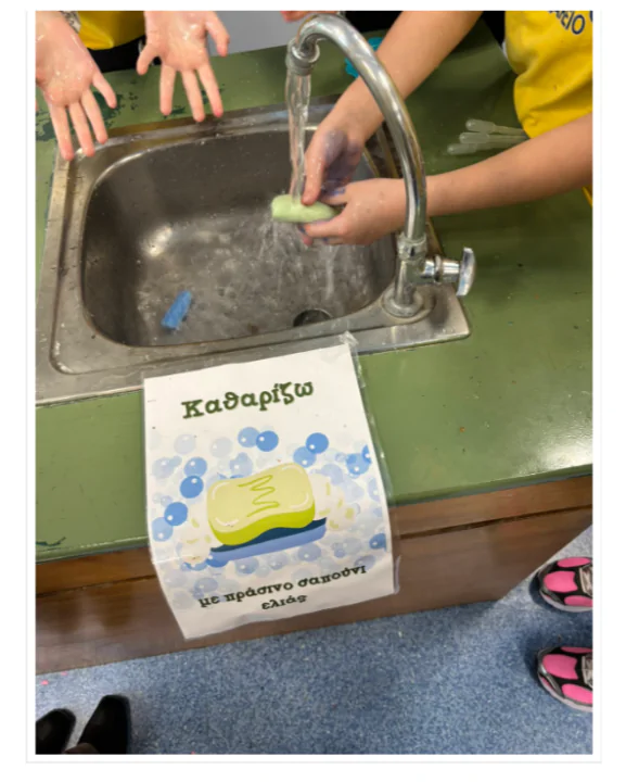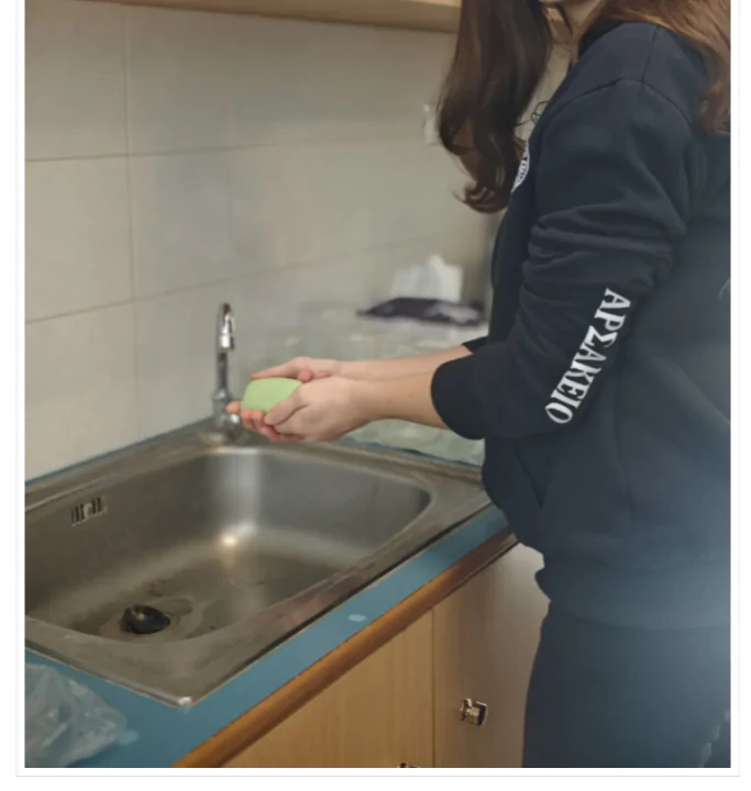 Οι καθηγήτριες κ. Μπάκα Αλεξάνδρα, βιολόγος, και κ. Μπούζη Πάολα, χημικός, ενθάρρυναν τους μαθητές να εξετάσουν πώς μπορούν να κάνουν τα εργαστήρια πιο ασφαλή, πιο υγιεινά και πιο φιλικά προς το περιβάλλον. Έτσι, τα κοινά καθαριστικά αντικαταστάθηκαν με το παραδοσιακό πράσινο σαπούνι ελαιόλαδου — ένα φυσικό προϊόν που δεν επιβαρύνει ούτε τους ανθρώπους ούτε τον πλανήτη.