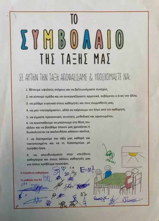 Κάθε σχολική χρονιά, οι μαθητές και ο υπεύθυνος καθηγητής της τάξης συμμετέχουν σε μια ιδιαίτερη και ουσιαστική διαδικασία: τη διαμόρφωση και «υπογραφή» του Συμβολαίου Τάξης. Πρόκειται για μια συμβολική αλλά βαθιά παιδαγωγική πράξη, μέσα από την οποία όλοι οι μαθητές συμφωνούν σε ένα κοινό πλαίσιο κανόνων, υποχρεώσεων και συμπεριφορών, που θα διέπει την καθημερινή ζωή της τάξης. Κατά τη διάρκεια αυτής της διαδικασίας, οι κανόνες συζητούνται ανοιχτά μεταξύ καθηγητή και μαθητών, αναλύονται οι υποχρεώσεις του καθενός, και δίνεται η δυνατότητα σε όλους να εκφράσουν τις απόψεις, τις προτάσεις και τις ανησυχίες τους. Όταν επιτευχθεί η κοινή συμφωνία, το Συμβόλαιο υπογράφεται από όλους, μια πράξη που συμβολίζει τον αλληλοσεβασμό, την υπευθυνότητα και τη δέσμευση για τήρηση των κανόνων που οι ίδιοι αποδέχθηκαν. Η διαδικασία αυτή είναι βαθιά δημοκρατική και εκπαιδευτική. Καλλιεργεί στους μαθητές την έννοια της συμμετοχής, της συνεργασίας και της αυτοπειθαρχίας. Ταυτόχρονα, προάγει τη σωστή αγωγή και διαμορφώνει μια θετική σχολική κουλτούρα, όπου κάθε μέλος της τάξης γνωρίζει τα δικαιώματα και τα καθήκοντά του. Το Συμβόλαιο Τάξης δεν είναι απλώς ένα έγγραφο. Είναι ένα ηθικό συμφωνητικό συνύπαρξης και συνεργασίας, ένας κοινός κώδικας που ενώνει τους μαθητές και τον εκπαιδευτικό σε μια μαθησιακή κοινότητα που βασίζεται στον σεβασμό, την ευθύνη και την εμπιστοσύνη.