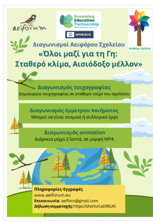 Το Σχολείο αλλιώς!» θα λάβει μέρος στον διαγωνισμό στην κατηγορία τοιχογραφίας. Οι μαθητές εργάζονται με φαντασία, συνεργασία και δημιουργικότητα για τη σχεδίαση και υλοποίηση μιας τοιχογραφίας σε χώρο του Σχολείου, εμπνευσμένης από τις αξίες της αειφορίας και της ενεργής συμμετοχής. Μέσα από τη διαδικασία του σχεδιασμού, της ανταλλαγής ιδεών και της καλλιτεχνικής δημιουργίας, οι μαθητές εκφράζουν τις σκέψεις και τις ανησυχίες τους για το περιβάλλον, στέλνοντας ένα αισιόδοξο μήνυμα για ένα βιώσιμο και συλλογικό αύριο.