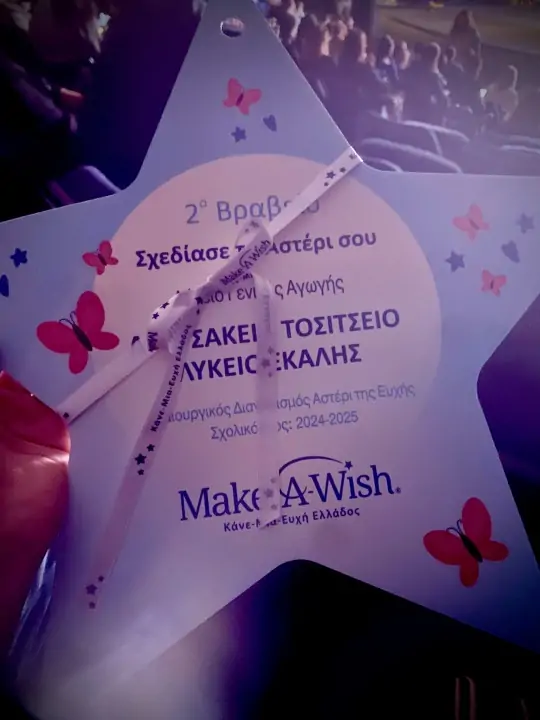 Το Σχολείο μας διακρίθηκε με το 2ο Βραβείο στην κατηγορία Λυκείου Γενικής Αγωγής, χάρη στο ομαδικό έργο των μαθητών τού τμήματος Καλλιτεχνικό Εργαστήρι τής Ζώνης Πολιτισμού. Υπό την καθοδήγηση τής καθηγήτριας Καλλιτεχνικών κ. Κυριακής Πρεβενιού, οι μαθητές μας: Λήδα Ιωαννίδου, Λυδία Γιαγτζή, Ευάγγελος Στεφανής και Νεφέλη Τσάπαλη δημιούργησαν έναν συγκινητικό Υπερ-ήρωα με το όνομα «Make A Wish», ο οποίος προστατεύει και αγκαλιάζει ένα παιδί, συμβολίζοντας τον ίδιο τον οργανισμό που χαρίζει δύναμη, ασφάλεια και ελπίδα στα παιδιά ευχής! Μέσα από αυτή τη δημιουργία, οι μαθητές μας αποτύπωσαν με ευαισθησία τις αξίες τής ανιδιοτελούς προσφοράς, τής ενσυναίσθησης και τής ελπίδας, αξίες που βρίσκονται στον πυρήνα τής αποστολής τού Make-A-Wish.
