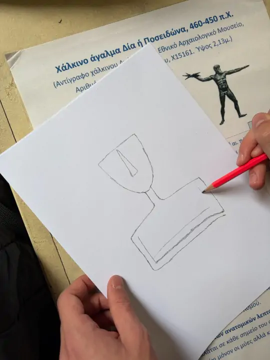 Στο δεύτερο μέρος τής επίσκεψης, οι μαθητές συμμετείχαν, με την καθοδήγηση τής καθηγήτριας Καλλιτεχνικών κ. Κυριακής Πρεβενιού, σε βιωματικό εργαστήριο σχεδίου. Αφού μοιράστηκαν υλικά (μολύβια, κάρβουνα και λευκά ξηρά παστέλ), κλήθηκαν να σχεδιάσουν εκ του φυσικού αντίγραφο κυκλαδικού ειδωλίου που φιλοξενείται στο Εργαστήριο Ιστορίας και Τέχνης. Εστίασαν στις κύριες γραμμές, στη λιτότητα τής φόρμας και στην κίνηση των χεριών, επιχειρώντας να αποδώσουν όχι μόνο την εξωτερική μορφή αλλά και την εσωτερική αρμονία τού έργου. Μέσα από τη διαδικασία τής παρατήρησης και της σχεδιαστικής απόδοσης καλλιέργησαν τη συγκέντρωση, την αισθητική αντίληψη και την ικανότητα ανάλυσης τής μορφής.