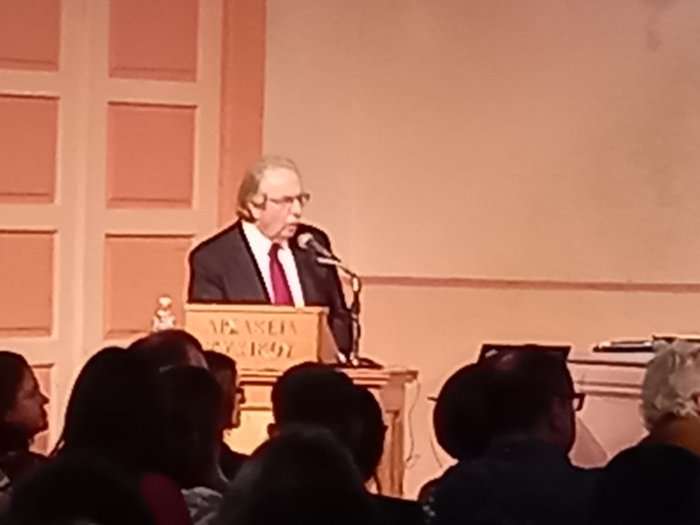 Ο μεγάλος ποιητής ευχαρίστησε για την πρόσκλησή του στον ιστορικό αυτό χώρο των Αρσακείων. Μία βράβευση για ένα λογοτέχνη, είπε, είναι μία δυνατότητα να δικαιωθεί και να πάει ακόμη παραπέρα. Υπάρχει, όμως, και ένα αρνητικό ενδεχόμενο. Ο βραβευθείς να νομίσει ότι έγινε χάρη στο βραβείο πολύ σπουδαίος, να κλειστεί στον εαυτό του, να βλέπει αφ’ υψηλού τους άλλους και να απομονωθεί. Γι’ αυτό πρέπει να αποφύγουμε αυτές τις αρνητικές συνέπειες. Όσοι λοιπόν δεν βραβεύθηκαν, ας συνεχίσουν την προσπάθεια και ας επικοινωνούν ισότιμα με εκείνους που βραβεύθηκαν.