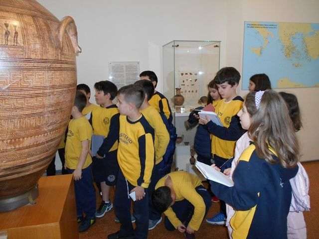 Η επίσκεψή τους άρχισε από τη γεωμετρική εποχή. Οι μαθητές γνώρισαν τα αγγεία που οι καλλιτέχνες φιλοτεχνούσαν και ήταν ζωγραφισμένα με γεωμετρικά σχέδια. Παρατήρησαν ένα αγγείο που θέμα του είχε τη μεταφορά τού νεκρού στον τόπο ταφής του. Είδαν και άλλους αμφορείς διακοσμημένους με πολλά και διαφορετικά ζώα και κατάλαβαν τον λόγο που η εποχή τού 8ου π.Χ. αιώνα ονομάστηκε γεωμετρική.