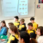 Την ίδια στιγμή, η σκυτάλη της δημιουργικότητας πέρασε στους μαθητές και στις μαθήτριες του Ε’2 του 1ου Δημοτικού Σχολείου Σκάλας Ωρωπού και Νέων Παλατίων, οι οποίοι/ες μετέτρεψαν την τάξη τους σε ένα εργαστήρι ανακάλυψης. Μέσα από ένα ομαδικό βιωματικό παιχνίδι με κάρτες, τα παιδιά «ξεκλείδωσαν» τις ημέρες της εβδομάδας του Ημερολογίου του Κουστώ στα Γαλλικά, εντάσσοντάς τις αμέσως σε καθημερινές φράσεις. Η δράση τους κορυφώθηκε με τη δημιουργία του “Du Ciel à la Mer” (Ο τοίχος των χρωμάτων), μια καλλιτεχνική παρέμβαση στον χώρο της τάξης τους. Εκεί, πλάσματα του βυθού και αντικείμενα της καθημερινότητας πήραν χρώμα, βοηθώντας τους/τες να οπτικοποιήσουν τη νέα γνώση και να την έχουν καθημερινά μπροστά τους ως ζωντανή υπενθύμιση του λαμπερού ουρανού και του πολύχρωμου βυθού.