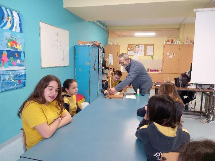 Με αφετηρία την Παγκόσμια Ημέρα Βιβλίου, οι μαθητές/-τριες τής Στ΄ τάξης, την 1η Απριλίου 2025, γνώρισαν την «περιπέτεια» ενός βιβλίου μέχρι να γίνει τόμος. Παρακολούθησαν, λοιπόν, στο Σχολείο τους πρόγραμμα που παρουσίασε ένας συντηρητής παλαιών βιβλίων, ειδικός στην καλλιτεχνική βιβλιοδεσία.