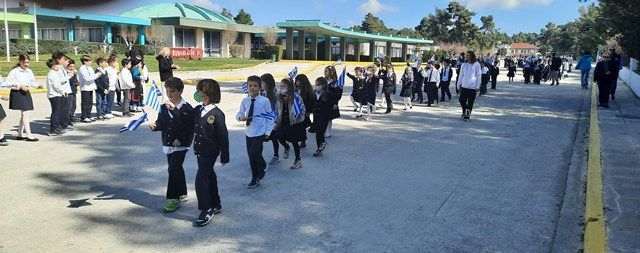 Οι μαθητές των τριών μικρότερων τάξεων, μετά την παρακολούθηση τής θεατρικής παράστασης, παρέλασαν κρατώντας σημαιάκια και καταχειροκροτήθηκαν από παριστάμενους γονείς και συμμαθητές τους.