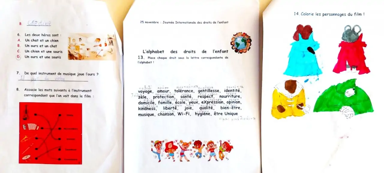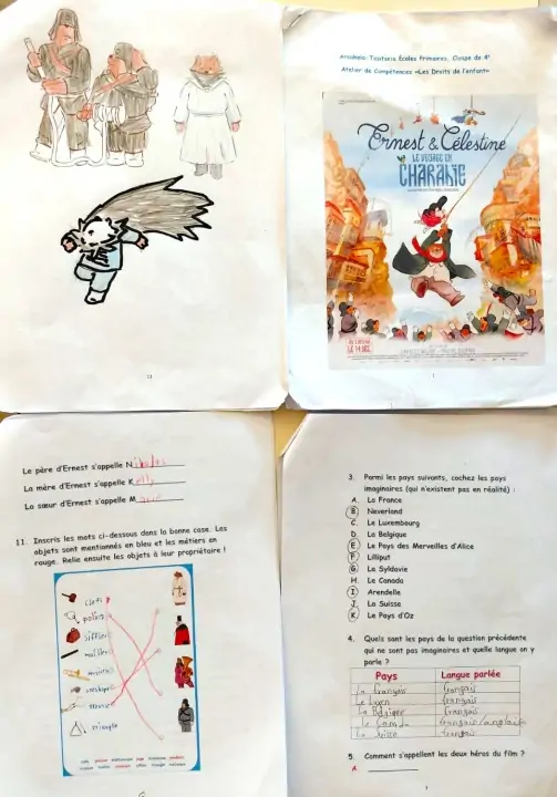 Αφορμή για τις δραστηριότητές στάθηκε η προβολή τής ταινίας κινουμένων σχεδίων “Ernest et Célestine : Le voyage en Charabie”, την οποία οι μαθητές/τριες παρακολούθησαν στο Γαλλικό Ινστιτούτο Ελλάδος στις 31 Οκτωβρίου 2025. Με αφετηρία αυτή την κινηματογραφική εμπειρία και με αφορμή την Παγκόσμια Ημέρα Δικαιωμάτων του Παιδιού (20 Νοεμβρίου) αλλά και την Παγκόσμια Ημέρα του Παιδιού (11 Δεκεμβρίου), που καθιερώθηκε από τον ΟΗΕ και τη UNICEF, τα παιδιά επεξεργάστηκαν εξειδικευμένο εκπαιδευτικό υλικό στα Γαλλικά.