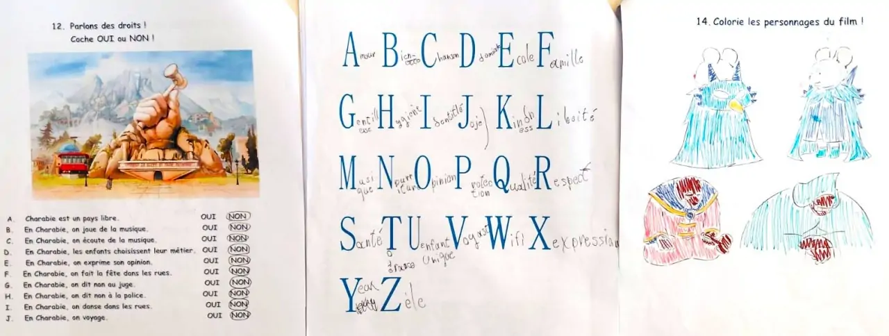 Μέσα από βιωματικές δραστηριότητες και γλωσσικά παιχνίδια, οι μαθητές εξοικειώθηκαν με πανανθρώπινες έννοιες όπως η ελευθερία (liberté), η αγάπη (amour) και ο σεβασμός (respect). Παράλληλα, ανακαλώντας στιγμιότυπα της ταινίας, ζωγράφισαν τους πρωταγωνιστές και συζήτησαν για την αξία της μουσικής και τις συνέπειες της στέρησής της στη φανταστική χώρα Charabie.