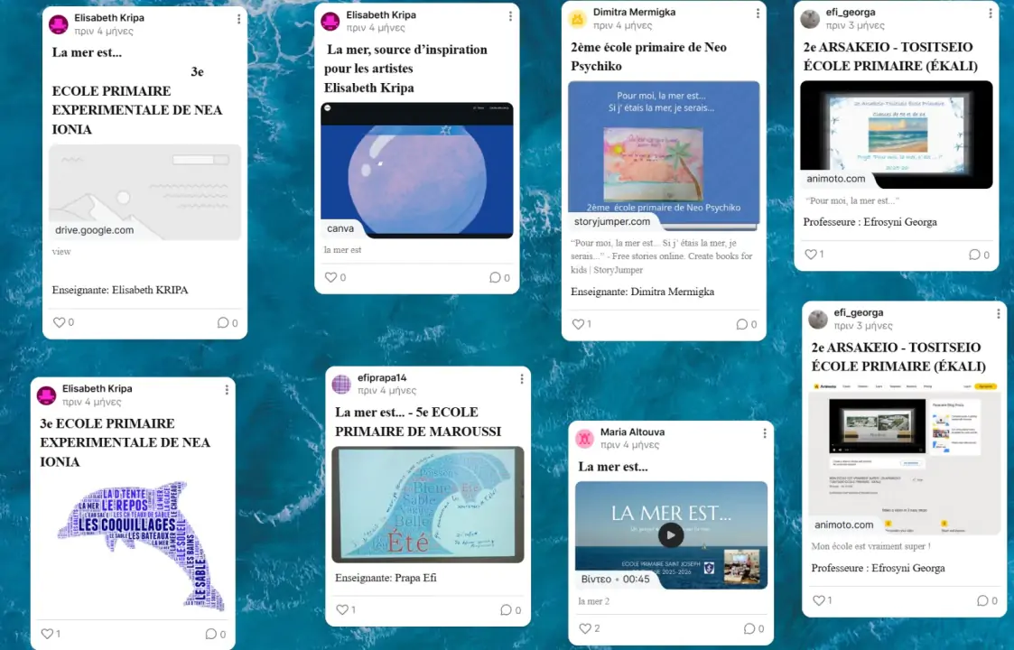 Χρησιμοποιώντας τη δημιουργική πλατφόρμα Padlet ως ψηφιακό λιμάνι, οι μαθητές μοιράζονται τις σκέψεις και τα έργα τους, αναπτύσσοντας παράλληλα πολύτιμες δεξιότητες συνεργασίας και ψηφιακού γραμματισμού . Για τους μικρούς μας δημιουργούς, η θάλασσα δεν είναι απλώς ένα θέμα μελέτης· είναι ο ουρανός, είναι οι διακοπές, είναι η ίδια η ζωή και η πηγή τής έμπνευσής τους. Η δράση αυτή, που ξεκίνησε με ενθουσιασμό τον Οκτώβριο υπό την καθοδήγηση τής καθηγήτριας Γαλλλικής γλώσσας κ. Ευφροσύνης Γεώργα, θα συνεχιστεί καθ’ όλη τη διάρκεια τής σχολικής χρονιάς.