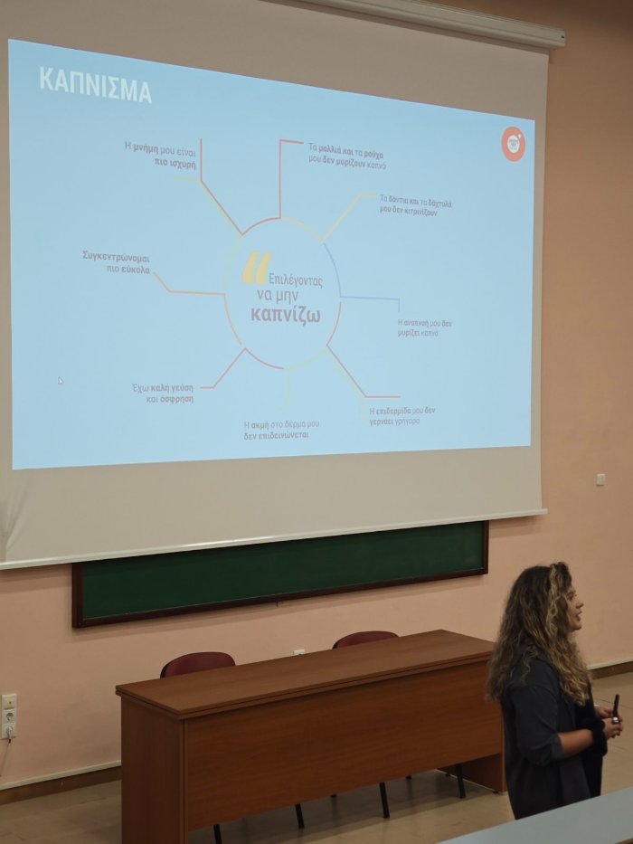 Η κ. Κορακιανίτη συζήτησε με τους μαθητές διάφορα θέματα που σχετίζονται με το κάπνισμα. Εστίασε στις αιτίες που οδηγούν τους νέους να αρχίσουν το κάπνισμα και στα επιστημονικά ευρήματα για τις βλαβερές επιπτώσεις τού καπνίσματος και των καπνικών προϊόντων στην υγεία. Με τη βοήθεια παραδειγμάτων και επιστημονικών δεδομένων, ανέδειξε τον εθιστικό και τον επικίνδυνο χαρακτήρα των καπνικών προϊόντων, πέρα από το συμβατικό τσιγάρο. Απάντησε σε απορίες που ήδη είχαν προετοιμάσει οι μαθητές/-τριες στο μάθημα τής Βιολογίας και έθεσε και δικές της ερωτήσεις, ενθαρρύνοντάς τους να συμμετάσχουν ενεργώς στην παρουσίαση.