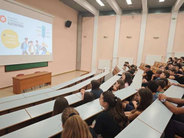 Την Παρασκευή 4 Οκτωβρίου 2024, στο αμφιθέατρο των Αρσακείων-Τοσιτσείων Σχολείων Εκάλης, οι μαθητές τής Α΄ και Γ΄ τάξεως τού Β΄ Αρσακείου-Τοσιτσείου Γυμνασίου Εκάλης παρακολούθησαν από την κ. Χριστίνα Κορακιανίτη, ψυχολόγο και συντονίστρια προληπτικών παρεμβάσεων, ομιλία για το κάπνισμα, τής πρωτοβουλίας “Smoke Free Greece” από το Ερευνητικό Εργαστήριο “George D. Behrakis” τής Ελληνικής Αντικαρκινικής Εταιρείας.