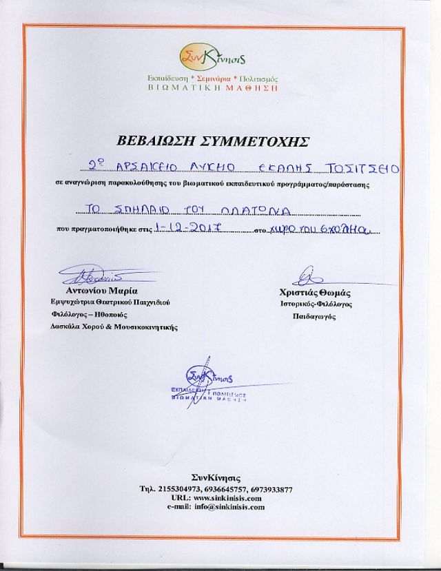 Την ευθύνη τού προγράμματος είχε η καθηγήτρια: κ. Βασιλόπουλου, τα Αρχαία Προσανατολισμού διδάσκουν οι εκπαιδευτικοί κ. Δημητριάδου και Ανδροβιτσανέας.