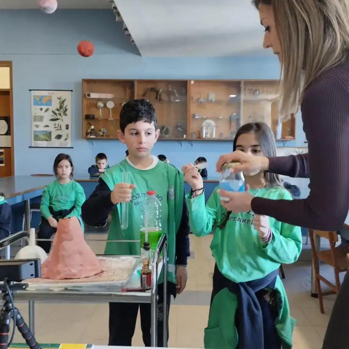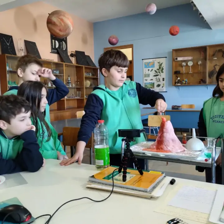 Την Τρίτη 3-3-2026 οι μαθητές τής Γ΄ τάξης του Γ΄ Αρσακείου- Τοσιτσείου Δημοτικού Σχολείου Εκάλης πραγματοποίησαν την 2η διαδικτυακή συνάντησή τους με τη Β΄ τάξη του Αρσακείου Ιωαννίνων στο πλαίσιο του προγράμματος «Από τη Μυθολογία στο Διάστημα – Myth2Space». Επισκέφτηκαν το Χημείο τού Σχολείου μας και με τη βοήθεια της κ. Στέλλας Χωριανοπούλου, Χημικού και παρασκευάστριας τού Σχολείου μας, παρουσίασαν στα παιδιά τής Β΄ τάξης ένα πειραματικό μοντέλο ηφαιστείου. Χρησιμοποιώντας απλά υλικά και ακολουθώντας τα κατάλληλα βήματα, δημιούργησαν μια ηφαιστειακή έκρηξη και έμαθαν πώς λειτουργούν οι δυνάμεις κάτω από τη γη και πώς προκαλούνται οι ηφαιστειακές εκρήξεις.