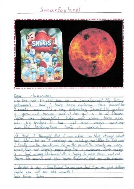 Αφού εξοικειώθηκαν με τα ονόματα των πλανητών και τα βασικά χαρακτηριστικά τους, παρακολουθώντας μια παρουσίαση (powerpoint), απάντησαν ερωτήσεις και έμαθαν αγγλικές ιδιωματικές φράσεις με λεξιλόγιο σχετικό με το Διάστημα. Με τη φαντασία τους ταξίδεψαν, επίσης, σε έναν φανταστικό πλανήτη και έστειλαν ένα email σε ένα φιλικό τους πρόσωπο, περιγράφοντας τα χρώματα και την επιφάνεια τού πλανήτη, καθώς και τα πλάσματα που συνάντησαν εκεί. Τέλος, με πολύ ενθουσιασμό παρουσίασαν τις εργασίες τους σε μαθητές σχολείων από την Πάτρα, την Κέα, τη Νάξο και την Κρήτη μέσω διαδικτυακής σύνδεσης.