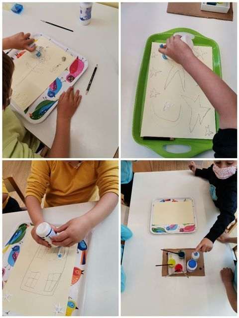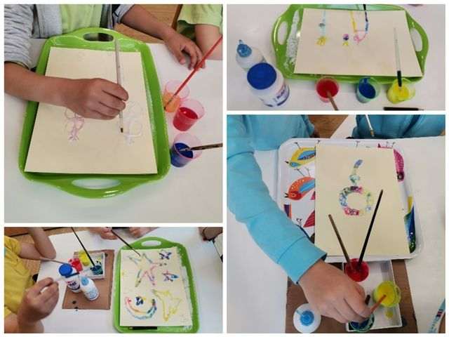 Τα παιδιά κάθε τμήματος, σε ομάδες, δημιούργησαν τέσσερα έργα χρησιμοποιώντας χαρτόνι, λευκή κόλλα, αλάτι, χρώματα ζαχαροπλαστικής, τέμπερες, πινέλα και μολύβι.