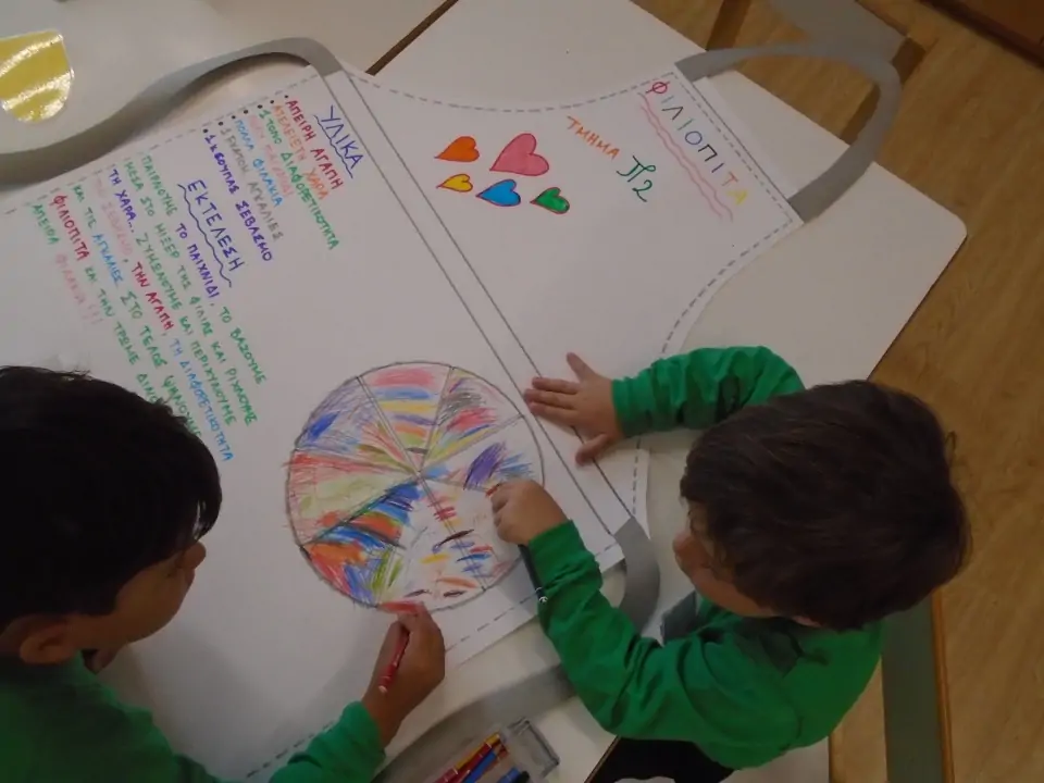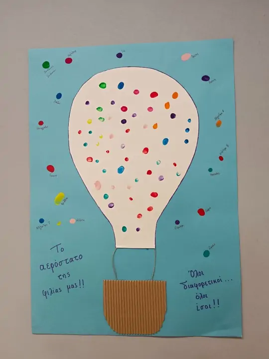 Μέσα σε αυτό το πλαίσιο γεννήθηκε το «αερόστατο τής φιλίας μας», μια αφίσα με τα δακτυλικά αποτυπώματα όλων των παιδιών. Το αερόστατο συμβολίζει τη μοναδικότητα κάθε μικρού μαθητή, αλλά και τη δύναμη τής ενότητας σε ένα μαγικό ταξίδι γνώσης, παιχνιδιού και συναισθηματικής ανάπτυξης, με οδηγό την αγάπη και τη συνεργασία.