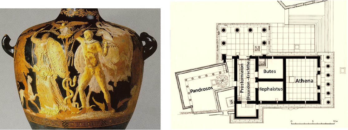 α. Η διεκδίκηση της Αττικής, υδρία, περ. 350 π.Χ., β. Κάτοψη Ερεχθείου. Το Προστομιαίον δυτικά