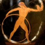 - Ερυθρόμορφος κρατήρας, νέος (Γανυμήδης) με τσέρκι και πετεινό, περ. 490 π.Χ., Λούβρο.