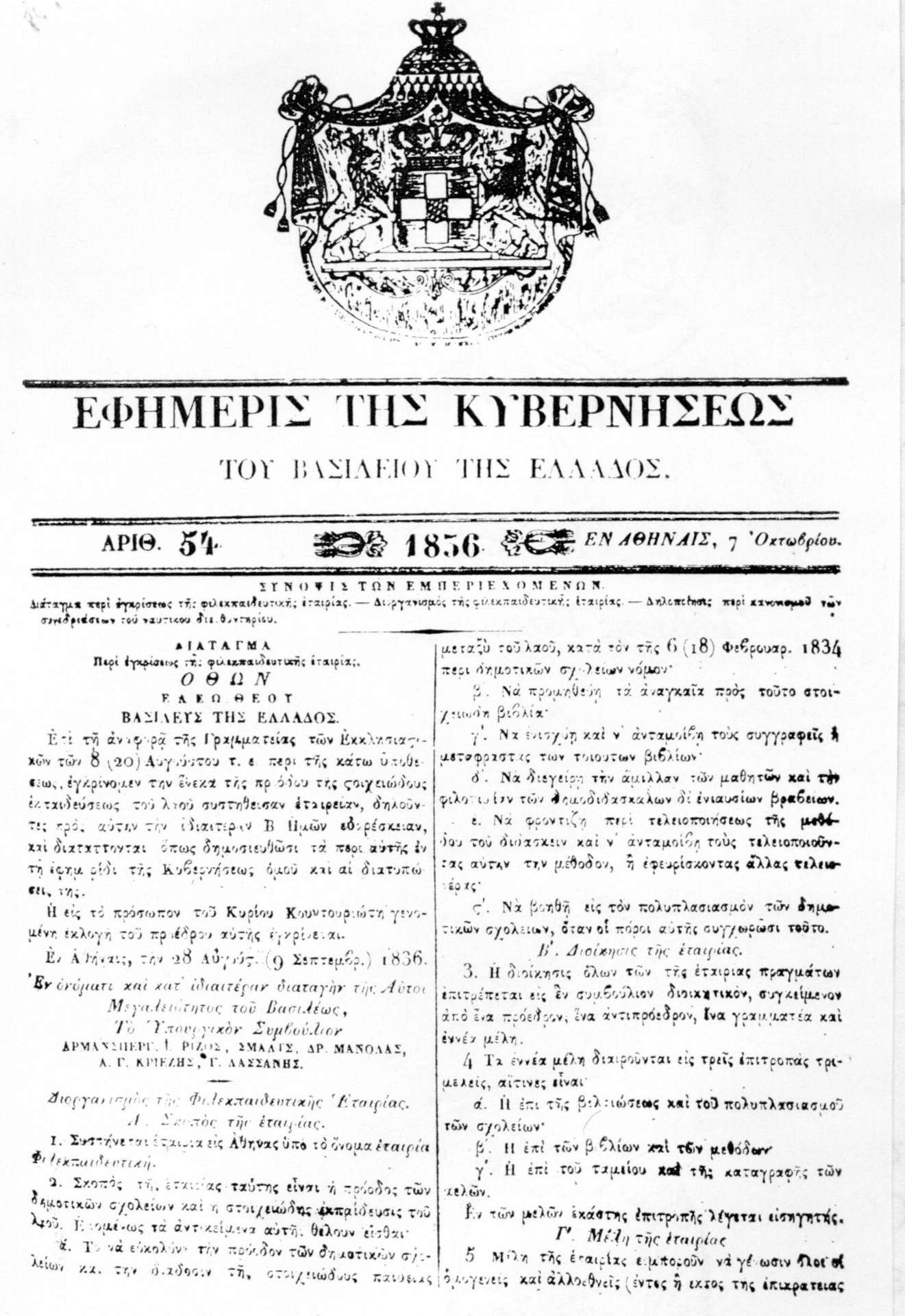 Στις 7 Οκτωβρίου 1836 και στο υπ’ αριθμόν 54 φύλλον της Εφημερίδος της Κυβερνήσεως (το Φ.Ε.Κ. εκείνης της εποχής) δημοσιεύθηκε η επίσημη απόφαση για την ίδρυση της Φιλεκπαιδευτικής Εταιρείας.
