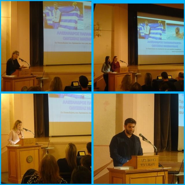 Την Πέμπτη 31 Οκτωβρίου 2024, στο θέατρο των Αρσακείων Ψυχικού, μία ευχάριστη έκπληξη περίμενε τούς μαθητές και τις μαθήτριες τής Β΄ τάξης τού Α΄ Αρσακείου Γυμνασίου Ψυχικού. Η Διευθύντρια τού Β΄ Αρσακείου Γενικού Λυκείου κ. Στέλλα Νάκη, φιλόλογος PhD, μας προσκάλεσε στο θέατρο για να συναντήσουμε δύο απόφοιτους τού Α΄ Αρσακείου Γυμνασίου και Λυκείου Ψυχικού: τον Αλέξανδρο Παπαναστασίου, αργυρό Ολυμπιονίκη τού πόλο, και τον Οδυσσέα Μασμανίδη, Πρωταθλητή τού πόλο.