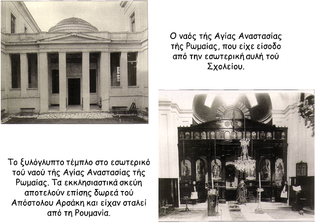 «Τά ἄκρα τῶν πτερύγων συνέδεεν ἐπί τοῦ ἐδάφους ὁ περικαλῆς μαθητικός ναός τῆς Ἁγίας Ἀναστασίας τῆς Ρωμαίας. Κτίσμα ἀρκετῆς ἐκτάσεως σέ σχῆμα έλλειψοειδές, δάπεδον μαρμάρινον, τέμπλον κάρυνον , μέ ὡραίας ἁγιογραφίας καί στέγην θολωτήν μέ πολυχρώμους ὑάλους ,ἐτιμᾶτο εἰς μνήμην τῆς Ἁγίας Ἀναστασίας τῆς Ρωμαίας. Σεβάσμιος γέρων Λευίτης προσήρχετο κατά τάς Κυριακάς καί τάς ἑορτάς διά τά ἐκκλησιαστικά καθήκοντα, διακονούμενος ὑπό δύο μικρῶν μαθητριῶν ἐξησκημένων εἰς τήν ὑπηρεσίαν. Ἑτέρα μικρά ἐπίσης ἠσχολεῖτο μέ τήν πώλησιν τῶν κηρίων. Εἰς τό ἄκουσμα τῆς καμπάνας μέ εὐλάβειαν καί θρησκευτικήν συναίσθησιν αἱ νεαραί προσήρχοντο εἰς τόν χῶρον τῆς κοινῆς λατρείας καί κατελάμβανον τάς θέσεις των.»