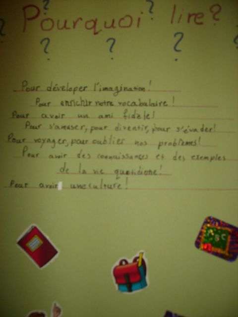 Στην Στ΄ τάξη οι μαθητές είχαν την ευκαιρία να δουν σειρά από παιδικά γαλλικά βιβλία τα οποία εκτέθηκαν σε κεντρικό χώρο τού Σχολείου και να επιλέξουν κάποια για να διαβάσουν. Επίσης, οι μαθητές τής τάξης της κ. Όλγας Δασκαλοπούλου ετοίμασαν ομαδική εργασία με τον τίτλο «Pourquoi lire?» («Γιατί διαβάζουμε;»). Στην παρουσίαση που έκαναν στην τάξη απεικόνισαν με διαφορετικούς τρόπους (κολλάζ, κείμενα, ζωγραφιές) και παρουσίασαν τους λόγους για τους οποίους διαβάζουμε.