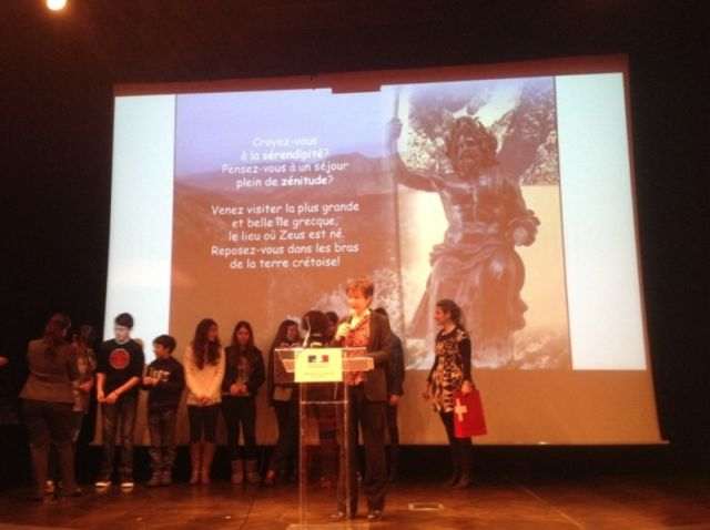 Βραβείο στον Διαγωνισμό κέρδισαν οι μαθητές τής Α΄ τάξης τού Α΄ Αρσακείου Γυμνασίου Ψυχικού. Τα παιδιά, συμμετέχοντας στον Διαγωνισμό, που εφέτος είχε θέμα «Πρόσκληση σε ταξίδι – Θεματικά ταξίδια στην Ελλάδα», εργάστηκαν συλλογικά από τον Δεκέμβριο τού 2014 μέχρι τον Φεβρουαρίου 2015 (12 διδακτικές ώρες) με την καθοδήγηση τής καθηγήτριας τους κ. Όλγας Δασκαλοπούλου. Με στόχο την προώθηση θεματικών ταξιδιών που αναδεικνύουν τον τοπικό πλούτο τής χώρας μας, οι μαθητές δημιούργησαν μια πρόσκληση σε μορφή power point με τίτλο «Séjour-découverte de la civilisation crétoise» («Διαμονή-ανακάλυψη τού κρητικού πολιτισμού»).