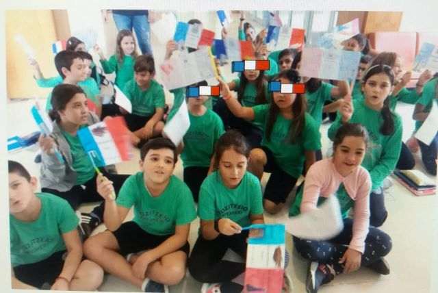 Οι μαθητές των Γ΄ και Δ΄ τάξεων χρωμάτισαν τη σημαία τής Γαλλίας και πάνω της κρέμασαν τρεις εικόνες αντιπροσωπευτικές τής χώρας αυτής: μια μπαγκέτα, την Παναγία των Παρισίων και φυσικά τον Πύργο τού Άιφελ. Τραγούδησαν, επίσης, ένα παραδοσιακό γαλλικό τραγούδι για την ηλικία τους και το επίπεδο τους.