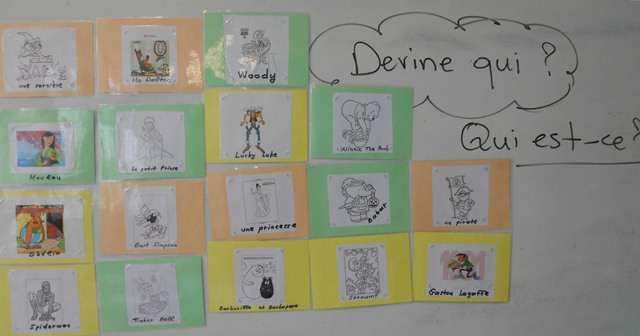 Τέλος, μοιράστηκαν τυχαία στους μαθητές, που ήταν χωρισμένοι σε ομάδες, διάφορες έγχρωμες κάρτες με αγαπημένους τους ήρωες εικονογραφημένων σχεδίων. Κάθε ομάδα, δείχνοντας τις κάρτες και δίνοντας τρία χαρακτηριστικά ενός ήρωα από αυτούς, προκάλεσε το ενδιαφέρον στις άλλες ομάδες στο να μαντέψουν και να βρουν τον εν λόγω ήρωα ρωτώντας τους: «C’ est qui? Devine!».
