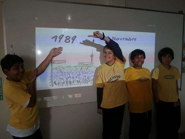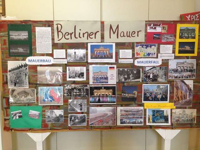 Το τείχος του Βερολίνου Με αφορμή τον εορτασμό των 25 χρόνων από την Πτώση του τείχους του Βερολίνου (9 Νοεμβρίου 2014) οι μαθητές της Ε΄ & Στ΄ τάξης του Γερμανικού τμήματος παρακολούθησαν παρουσίαση και video με την ιστορία του τείχους από τη δημιουργία μέχρι την πτώση του. Στη συνέχεια φιλοτέχνησαν ταμπλό με εικόνες συγκρίνοντας το Βερολίνο πριν και μετά την ενοποίηση. Τέλος οι μαθητές επεξεργάστηκαν φυλλάδιο με σχετικό λεξιλόγιο, συγκρατώντας με αυτό τον τρόπο τις σημαντικότερες πληροφορίες. |