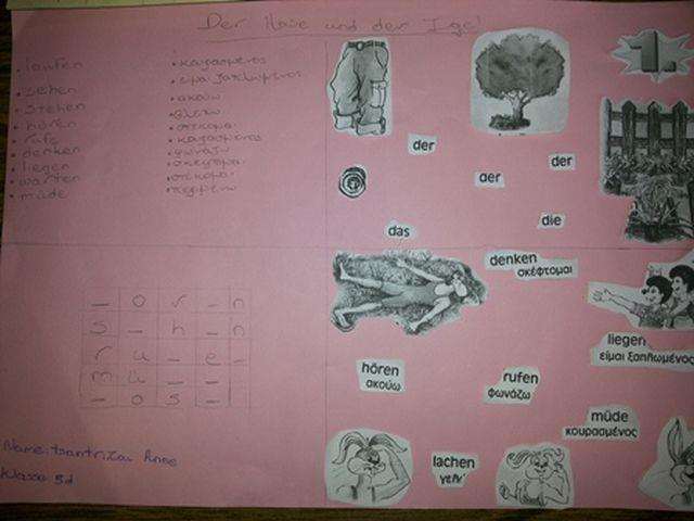 Φιλαναγνωσία Στο πλαίσιο της «Φιλαναγνωσίας» οι μαθητές του Γερμανικού τμήματος διάβασαν με τις καθηγήτριές τους τα γνωστά παραμύθια των αδερφών Γκριμ „Die Bremer Stadtmusikanten“ και „Der Hase und der Igel“. Οι μαθητές εξοικειώθηκαν με το λεξιλόγιο διασκεδάζοντας: ετοίμασαν μικρές διασκεδαστικές ασκήσεις, ζωγράφισαν, κατασκεύασαν ταμπλό, περιέγραψαν και δραματοποίησαν σκηνές που τους άρεσαν. |