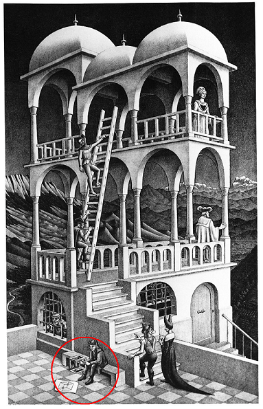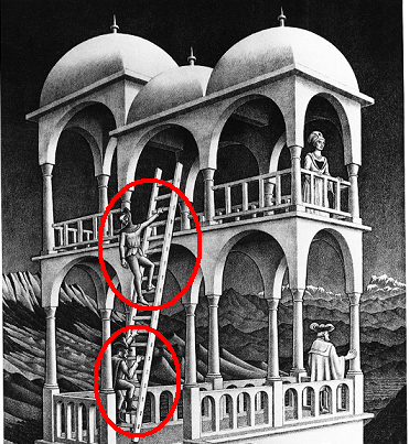 Το αγόρι που κάθεται στο παγκάκι φαίνεται να βρίσκεται αντιμέτωπο με τέτοιου είδους προβληματισμούς και δεν αντιλαμβάνεται ότι ο πύργος πίσω του (εικόνα 3η) έχει κτισθεί με το ίδιο απερίγραπτο στυλ. Στο δάπεδο της κατώτερης πλατφόρμας, είναι τοποθετημένη μια ανεμόσκαλα την οποία ανεβαίνουν δυο άνθρωποι. Μπορούμε με βεβαιότητα να αποφανθούμε που είναι τοποθετημένη η βάση της σκάλας; Μέσα ή έξω από το κτήριο; Τέτοιοι προβληματισμοί αμφι-σημειακού χαρακτήρα (οφθαλμαπάτες) που προέκυψαν εκφραστικά μέσα από εικαστικές προκλήσεις, δημιουργούν ανάγκες κατανόησης του φαινομένου, η απάντηση των οποίων μπορεί να αναζητηθεί μόνο λογικά και ειδικότερα μέσα από τη Γεωμετρία.