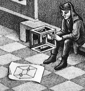 Για παράδειγμα στον εικονιζόμενο πίνακα του Έσσερ (Belvedere) (εικόνα 1η ) στο κατώτερο αριστερό πλάνο, μέσα στον κόκκινο κύκλο (λεπτομέρεια εικόνα 2η ), βρίσκεται ένα φύλλο χαρτιού στο οποίο είναι σχεδιασμένες οι ακμές ενός κύβου. Δυο μικροί κύκλοι σημαδεύουν τα σημεία που οι ακμές τέμνουν η μία την άλλη.