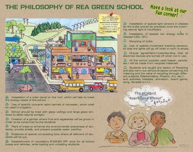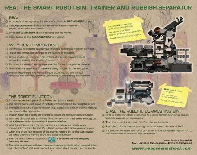 Στην πρόταση για το “πράσινο σχολείο” στόχος είναι ολόκληρη η σχολική μονάδα να είναι συνδεδεμένη με ένα έξυπνο ρομπότ, εκπαιδευτή-διαχωριστή, που ονομάζεται “Ρέα”, το οποίο θα είναι τοποθετημένο στον προαύλιεο χώρο τού σχολείου.