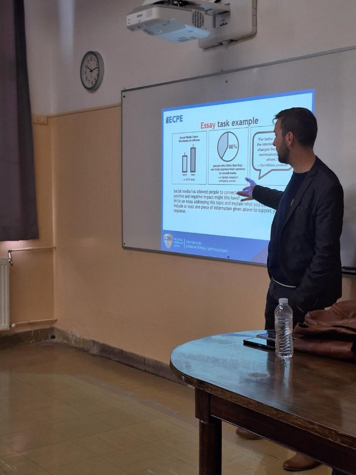 Στο πλαίσιο των επιμορφωτικών δράσεων τού μαθήματος τής Αγγλικής Γλώσσας, μαθητές των Αρσακείων Γυμνασίων και Λυκείων Ψυχικού και Εκάλης παρακολούθησαν δίωρη παρουσίαση-εργαστήριο, στις 13 και 14 Νοεμβρίου 2024, από τον υπεύθυνο τού Ακαδημαϊκού Τμήματος τής Ελληνοαμερικανικής Ένωσης κ. Loic Balory. Θέμα τής επιμόρφωσης οι εξετάσεις γλωσσομάθειας τού Πανεπιστημίου τού Michigan, για τα επίπεδα Β2 (Lower) και C2 (Proficiency).